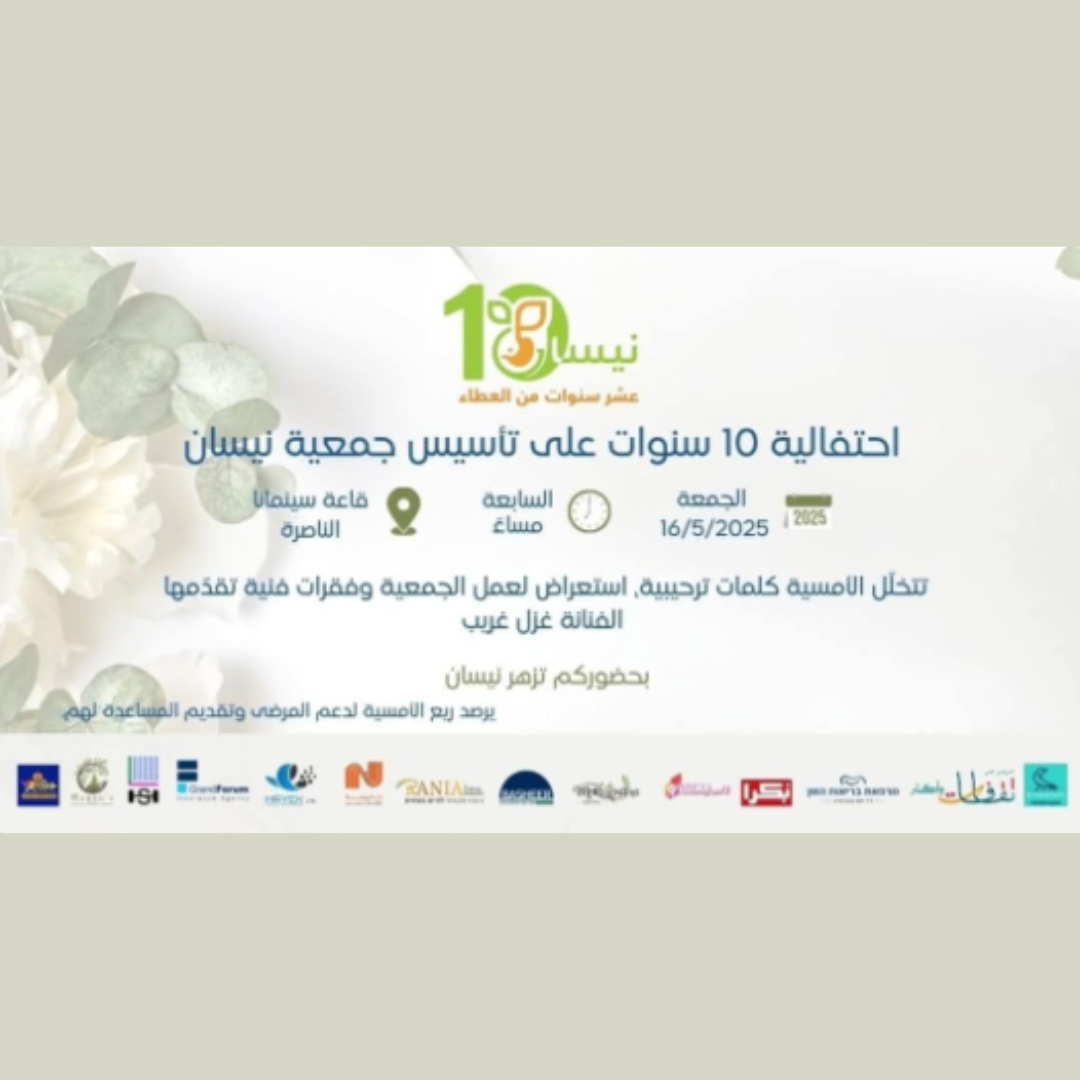 جمعية نيسان تتقدّم بجزيل الشكر والتقدير لكل من ساهم بإنجاح هذه الأمسية من داخل البلاد أو خارجها، ولكل من شاركنا بالحضور من شتى البلدات، وأصدقاؤنا الأعزاء في القدس على الدعم والتعاون.